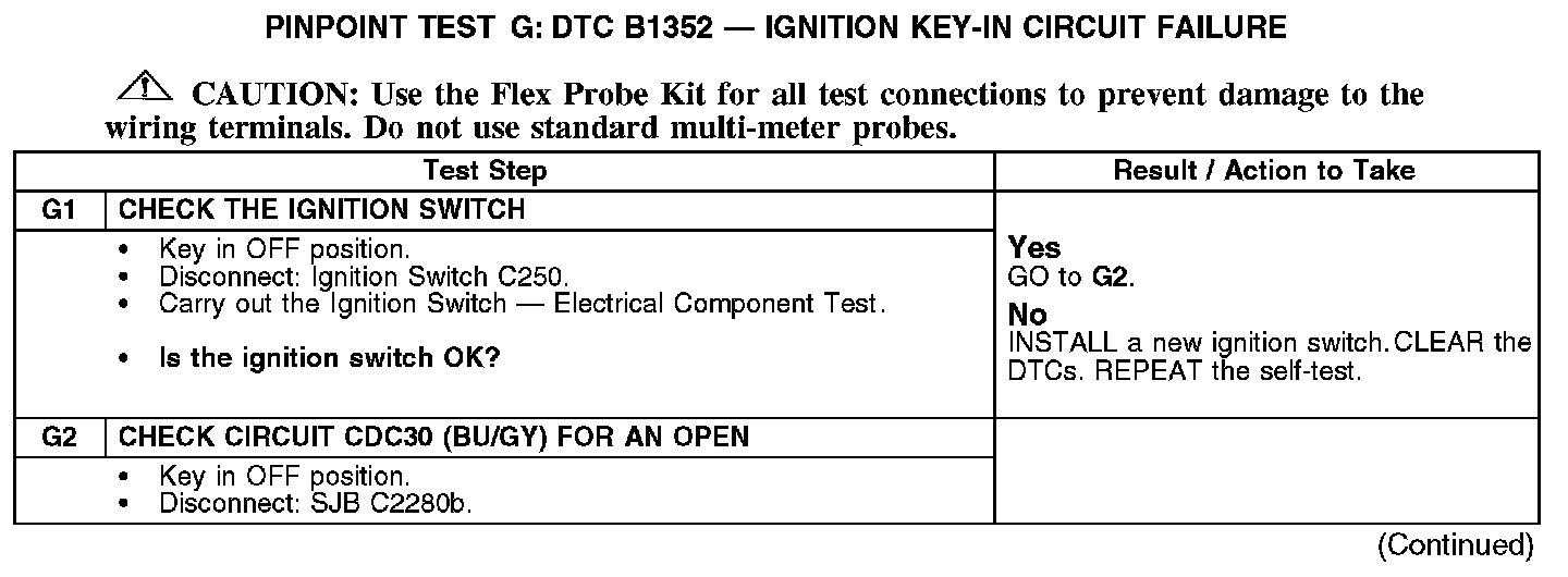 Pinpoint Test G: DTC B1352 - Ignition Key-In Circuit FailureRefer to Vehicle/Diagrams, Power Distribution/SJB for schematic and connector information.