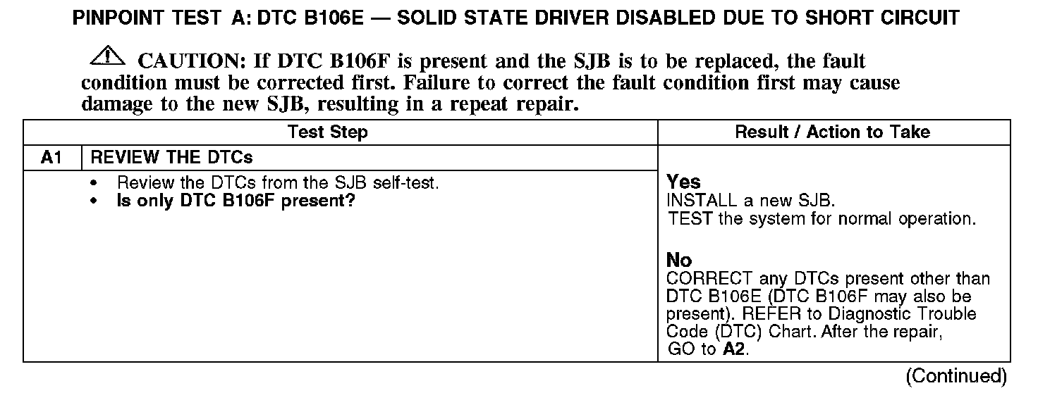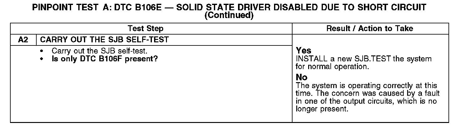 PINPOINT TEST A: DTC B106E - SOLID STATE DRIVER DISABLED DUE TO SHORT CIRCUITNormal Operation