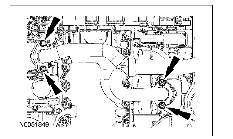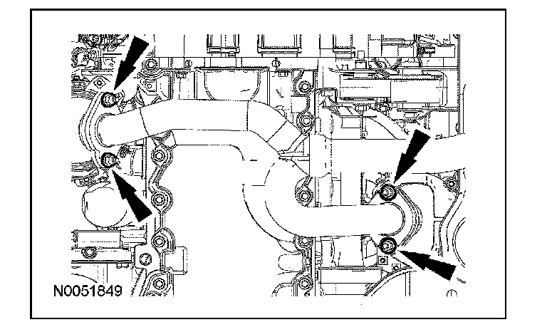 2. CAUTION: Place clean, lint-free shop towels over exposed engine cavities. Carefully remove the towels so foreign material is not dropped into the engine. Any foreign material (including any material created while cleaning gasket surfaces) that enters the oil passages or the oil pan may cause engine failure.