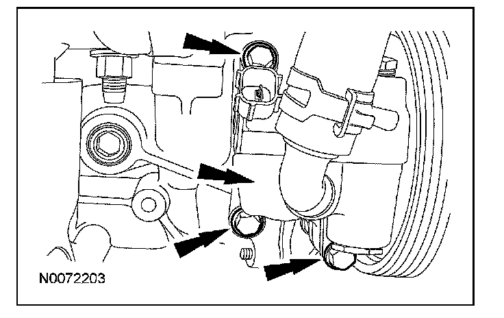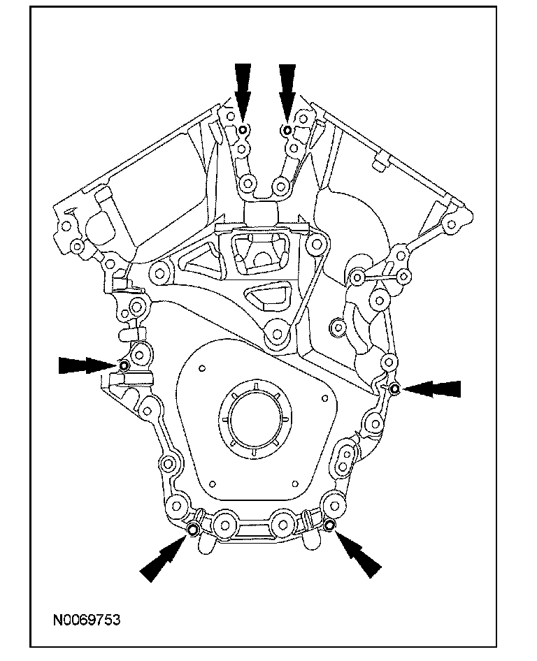 ^ Apply a 5.5 mm (0.21 in) bead of Motorcraft High Performance Engine RTV Silicone to the oil pan-to-cylinder block joint and the cylinder head-to-cylinder block joint areas of the engine front cover in 5 places as indicated.