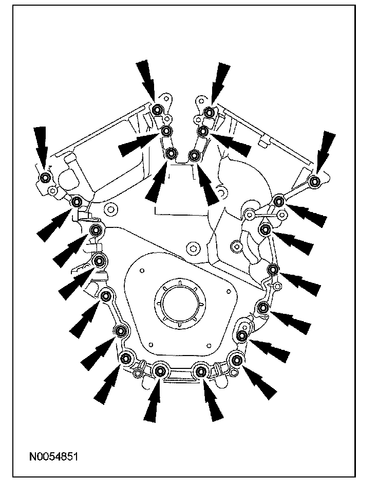 ^ Tighten the bolts one turn at a time in a criss-cross pattern until the engine front cover-to-cylinder block seal is released.