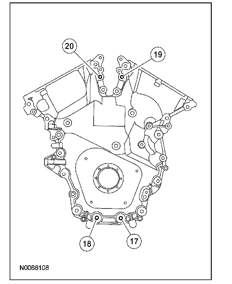 NOTE: The engine front cover and bolts 17, 18, 19 and 20 must be installed within 4 minutes of the initial sealant application. The remainder of the engine front cover bolts and the engine mount bracket bolts must be installed and tighten within 35 minutes of the initial sealant application. If the time limits are exceeded, the sealant must be removed, the sealing area cleaned and sealant reapplied. To clean the sealing area, use silicone gasket remover and metal surface prep. Failure to follow this procedure can cause future oil leakage.