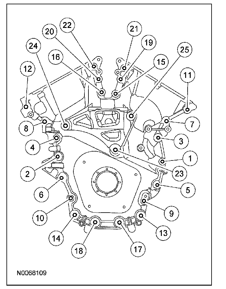^ Stage 1: Tighten bolts 1 thru 22 to 10 Nm (89 lb-in) and bolts 23, 24 and 25 to 15 Nm (11 lb-ft).