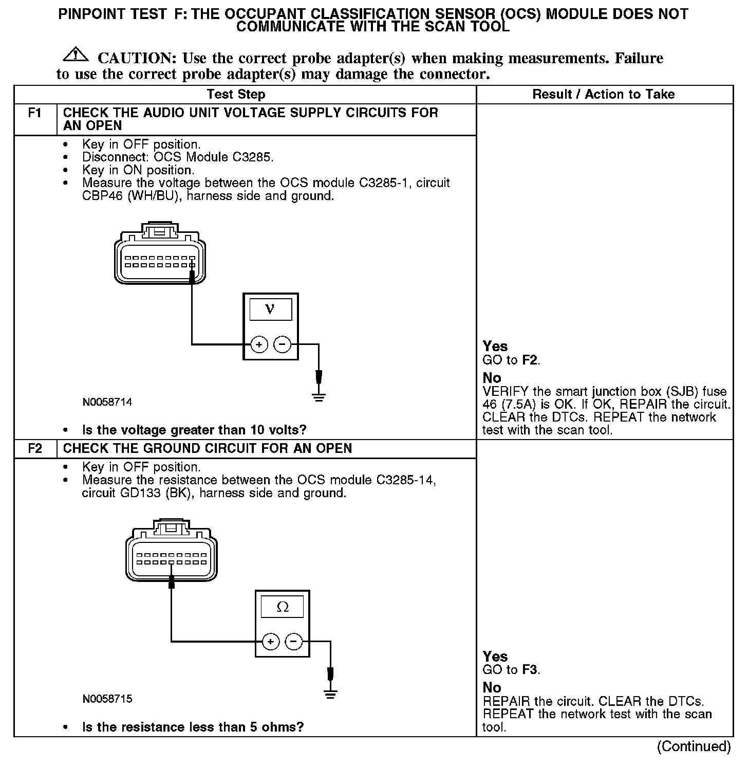 PINPOINT TEST F: THE OCCUPANT CLASSIFICATION SENSOR (OCS) MODULE DOES NOT COMMUNICATE WITH THE SCAN TOOL
