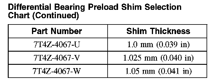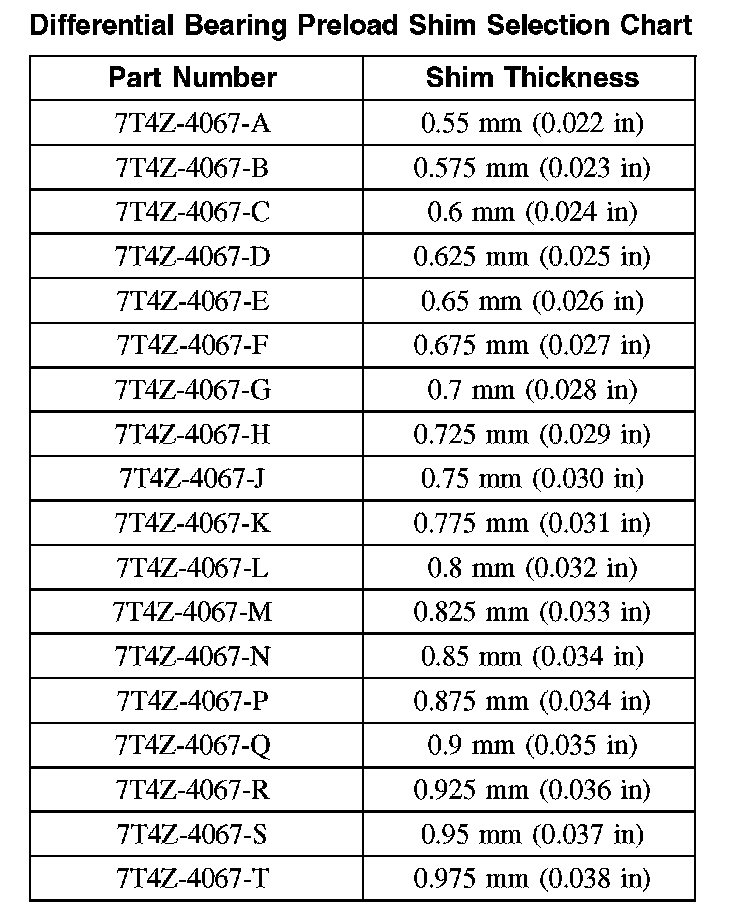 Differential Bearing Preload Shim Selection Chart