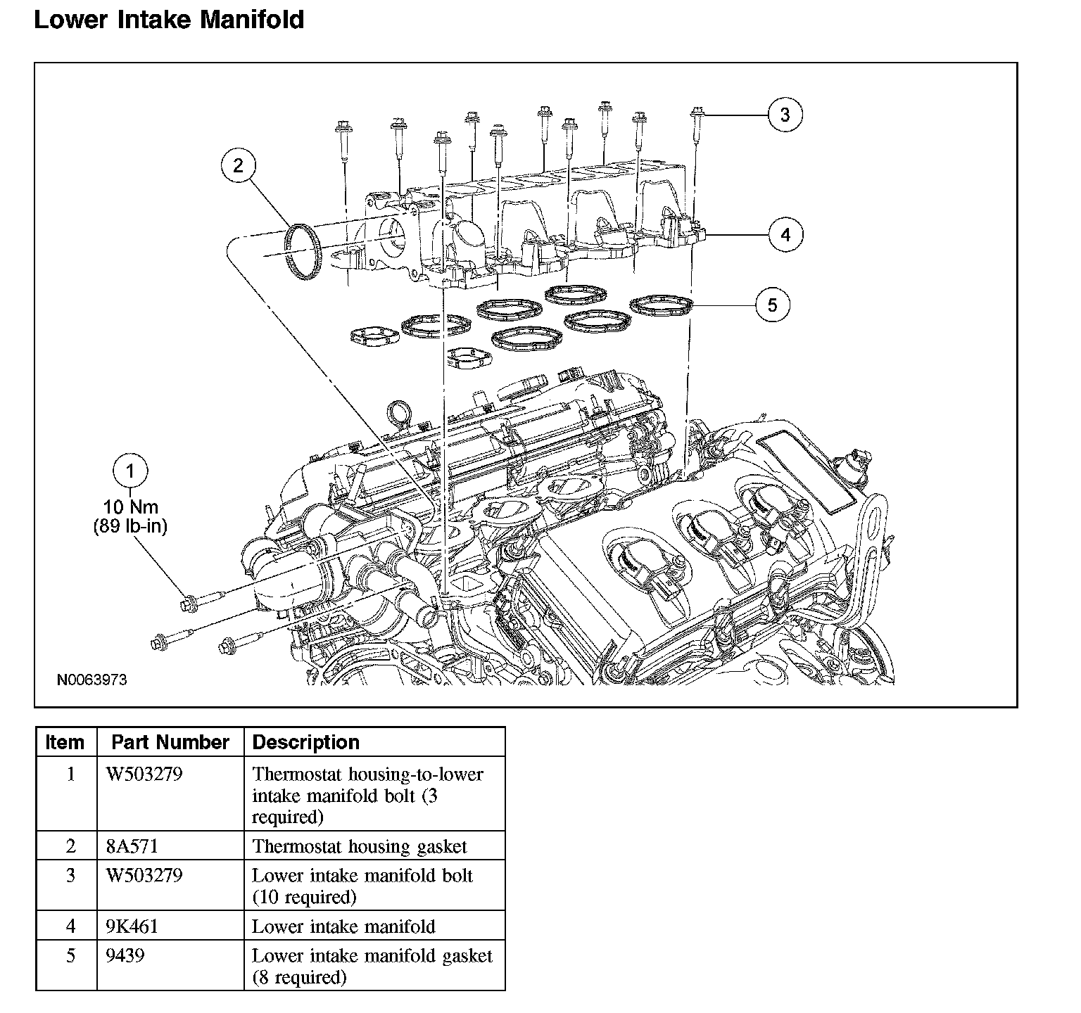 1. Using new intake manifold and thermostat housing gaskets, install the lower intake manifold and the 10 bolts.