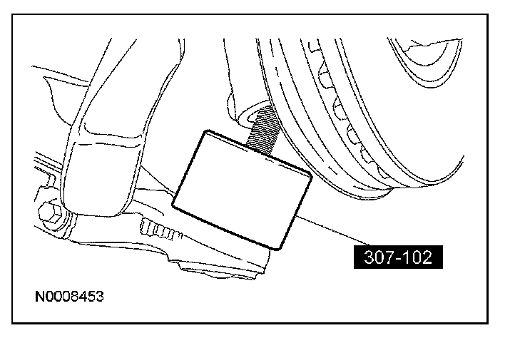 8. After separating the lower arm ball joint from the wheel knuckle, immediately install the special tool over the ball stud before releasing the lower arm and knuckle into the rest position.