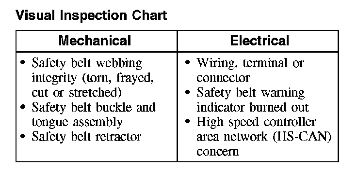 3. If the inspection reveals an obvious concern(s) that can be readily identified, service as required. With the exception of removing a twist from the safety belt webbing, do not attempt to repair a component of the safety belt system; new components must be installed.