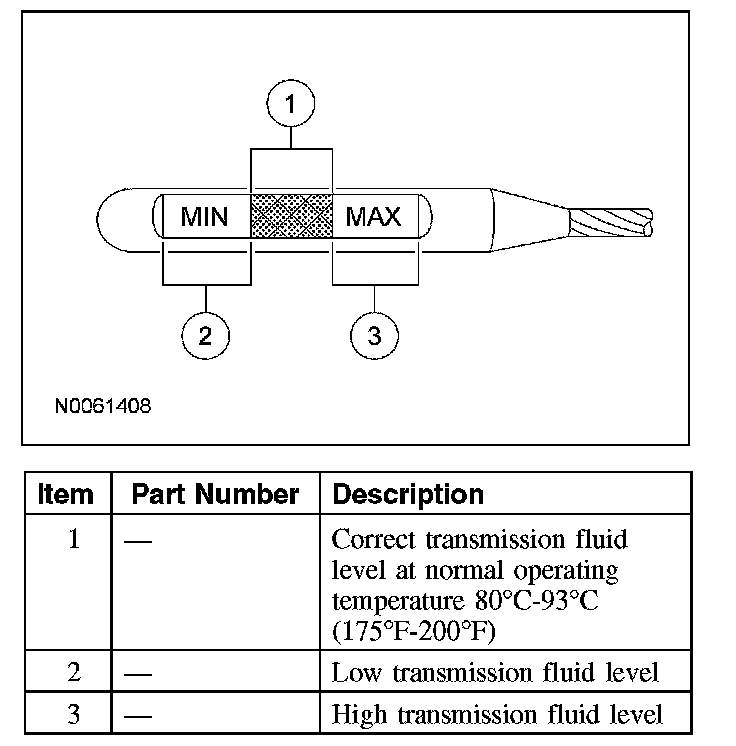 The transmission fluid level reading on the transmission fluid level indicator will differ depending on operating and ambient temperatures. The correct reading should be within the normal operating temperature range.