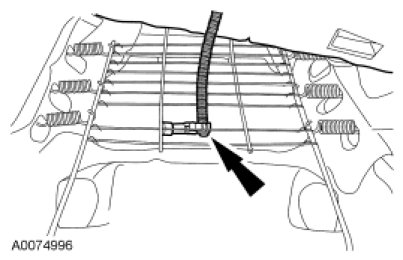 - Using an OCS system service kit, feed the OCSM, electrical connector, wire harness, pressure sensor and hose through the largest opening at the front of the seat cushion frame support assembly as noted during removal.