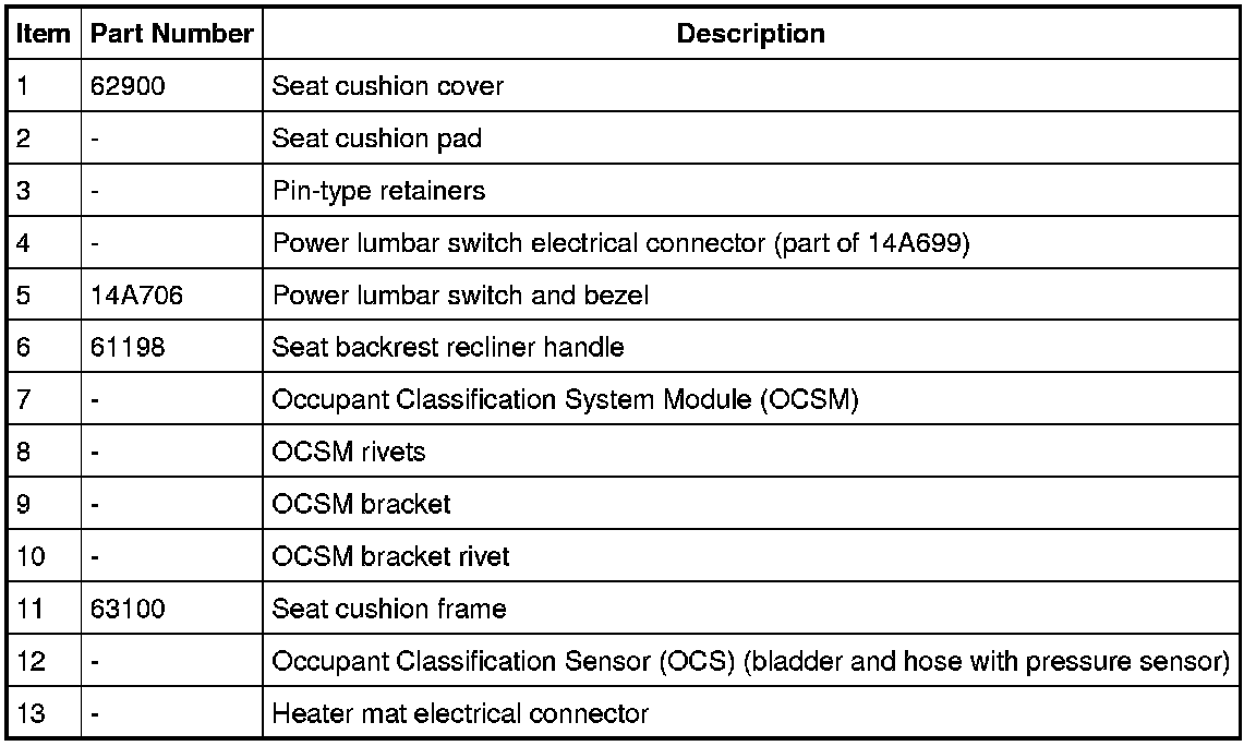 WARNING: Install a new occupant classification sensor (OCS) system service kit as a complete assembly. Never install only part of the kit components. Failure to follow this instruction may result in incorrect operation of the OCS system and increases the risk of serious personal injury or death in a crash.