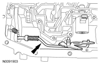 40. Install the manual control valve detent lever and parking lever actuating rod.