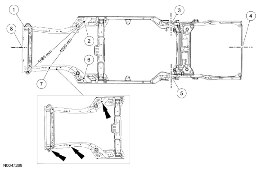 27. Check the position of the front body mount on both the left and right hand rails. Measure the diagonal distance from master locator hole A1 to the front body mount and record it. Repeat for master locator hole A2. This distance should be 1,689 mm (66.49 in). The difference between the 2 measurements should not exceed 6 mm (0.23 in).