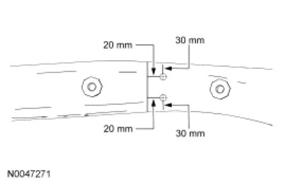 - When the sleeves are in place, check the fit and alignment of the service part rail. Insert and support the rail and the sleeve into the vehicle, leaving a 5 mm (0.19 in) gap at the butt joint when measuring the alignment.