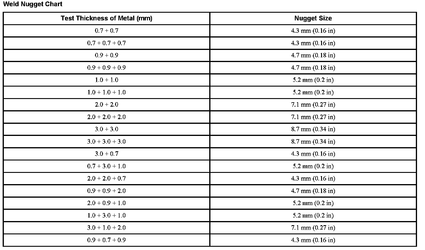 Weld Nugget Chart: