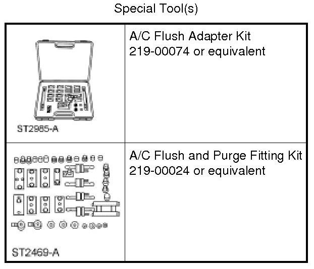 NOTICE: On vehicles being serviced for an internal compressor or desiccant failure, a new suction accumulator or receiver/drier, Thermostatic Expansion Valve (TXV) or evaporator core orifice and any hoses containing mufflers must be installed prior to filtering the Air Conditioning (A/C) system. Internal plumbing of these devices makes it impossible to correctly remove any foreign material. These components are typically discarded after A/C system contamination. Hoses without mufflers can normally be reused unless they are clogged with foreign material. The filter is intended for use on one vehicle only.