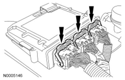 2. Release the clips and disconnect the 3 PCM electrical connectors.