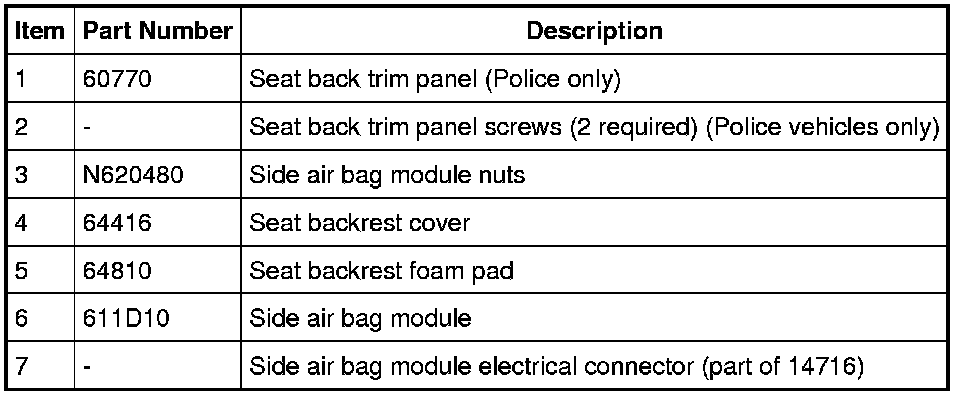 NOTE: When installing a new side air bag after deployment, refer to Seats for additional information concerning the installation of a new side air bag.