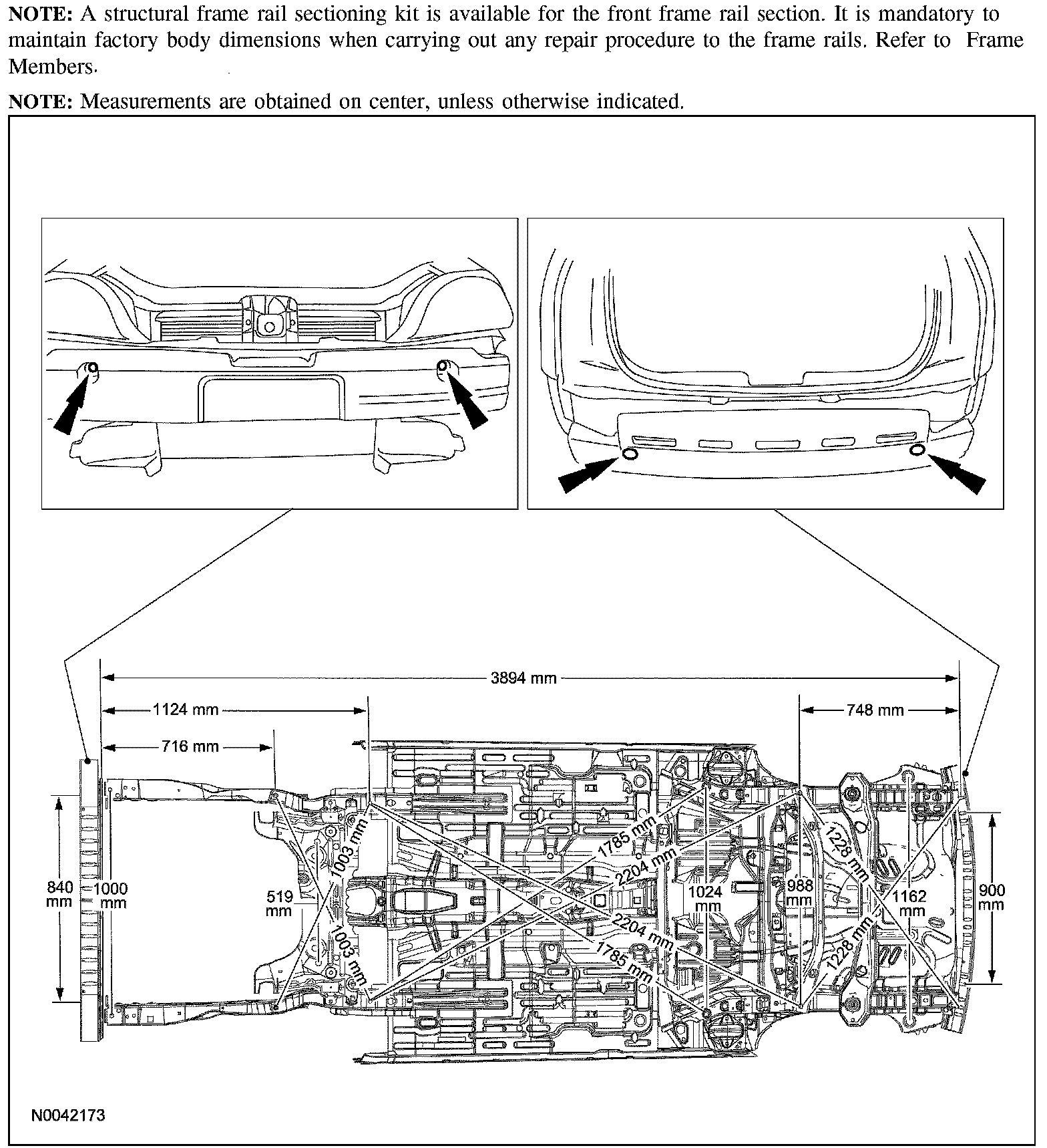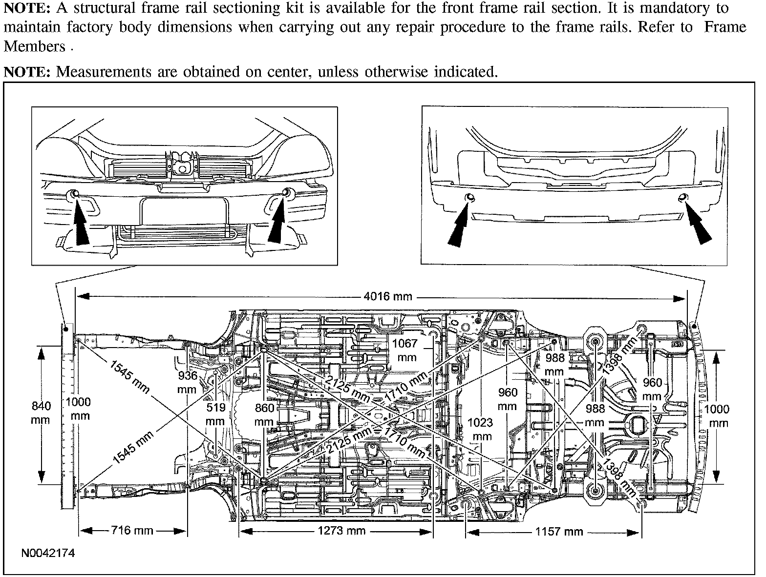 WARNING: Frame rail crush zones absorb crash energy during a collision and must be replaced damaged. Straighten damaged frame rails to correct frame dimensions prior to frame member sectioning. Failure to follow these instructions may adversely affect frame rail performance and may result in serious personal injury to vehicle occupant(s).
