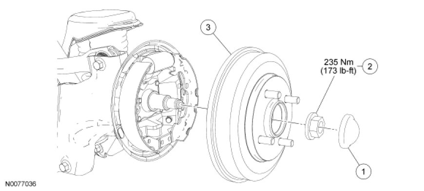 1. NOTICE: When tightening the new wheel hub nut, rotate the brake drum counterclockwise until the correct torque is achieved or damage to the wheel bearing may occur.