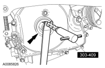 NOTICE: Do not loosen or remove the crankshaft pulley bolt without first installing the special tools as instructed in this procedure. The crankshaft pulley and the crankshaft timing sprocket are not keyed to the crankshaft. The crankshaft, the crankshaft sprocket and the pulley are fitted together by friction, using diamond washers between the flange faces on each part. For that reason, the crankshaft sprocket is also unfastened if the pulley bolt is loosened. Before any repair requiring loosening or removal of the crankshaft pulley bolt, the crankshaft and camshafts must be locked in place by the special service tools, otherwise severe engine damage can occur.