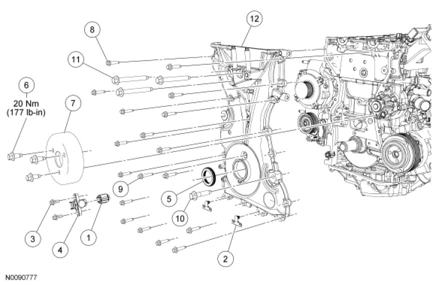 3. Install the engine front cover. Tighten the bolts in the sequence shown, to the following specifications: