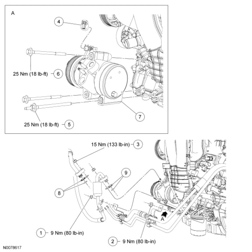 Remove the A/C compressor suction and discharge fitting nuts and disconnect the suction fitting.