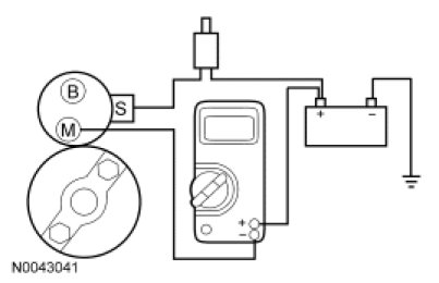 7. Remove the cables from solenoid B-, S- and M-terminals. Clean the cables and connections and reinstall the cables to the correct terminals. Repeat Steps 3 through 6. If the voltage drop reading is still greater than 0.8 volt when checked at the M-terminal and less than 0.8 volt when checked at the B-terminal, the concern is in the solenoid contacts. Install a new starter motor.