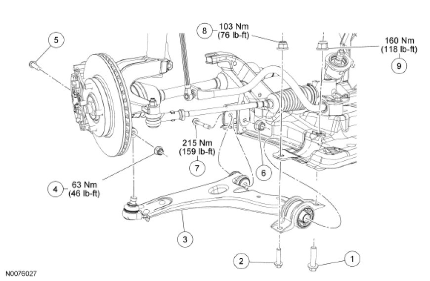6. Tighten the lower arm forward bolt to 215 Nm (159 lb-ft).