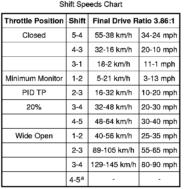 3. Apply minimum throttle and observe the speeds at which upshift occurs and torque converter engages. Refer to the following Shift Speeds Chart for the appropriate final drive ratio.