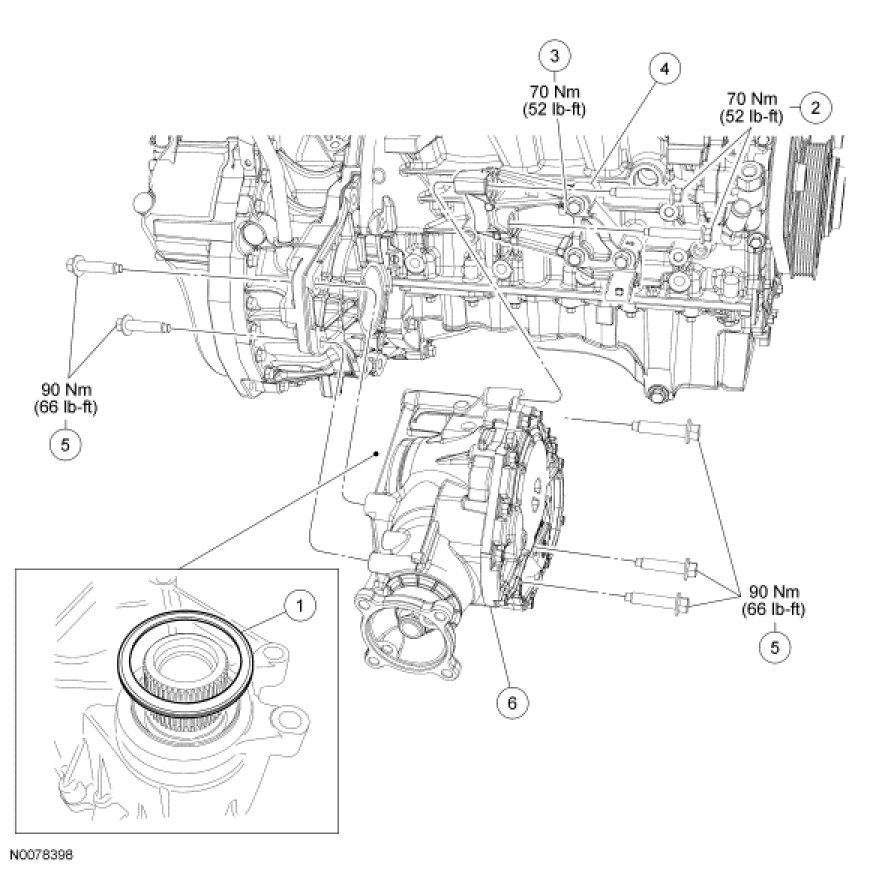 1. Tighten the bolts to the transaxle to 70 Nm (52 lb-ft).