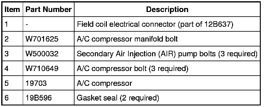 NOTE: A new A/C compressor may come equipped with an A/C clutch disc and hub, A/C compressor pulley and A/C clutch field coil already installed. If these components are not pre-installed, it will be necessary to transfer these parts from the old A/C compressor to the new compressor prior to installation of the A/C compressor if suitable for reuse.