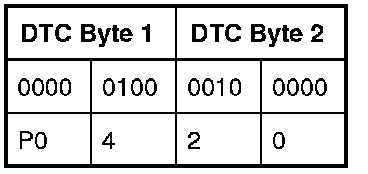 Like all digital signals, DTCs are sent to the scan tool as a series of 1s and 0s. Each DTC is made up of two data bytes which each consist of 8 bits that can be set to 1 or 0. The data is decoded by the scan tool to display each set of 4 bits as a hexadecimal number (0 to F) in order to display the DTCs in the conventional format. For example, P0420 Catalyst System Efficiency Below Threshold (Bank 1).