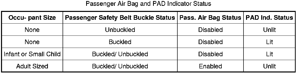 The following table indicates the passenger air bag status and the PAD indicator status based the size of the front passenger occupant.