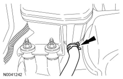 58. Remove the bolt and the ground wire from the engine mount bracket.