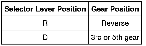 With the fail-safe function, if any malfunction should occur in the transaxle system, the TCM will output a control signal, and control will be carried out to make traveling a minimum distance possible. If all shift solenoids malfunction, the TCM will cancel the output of control signals to the solenoids. If this happens, the automatic transmission gear shifting will be controlled by transmission fluid pressure circuits only and the gears will shift as shown in the following table.