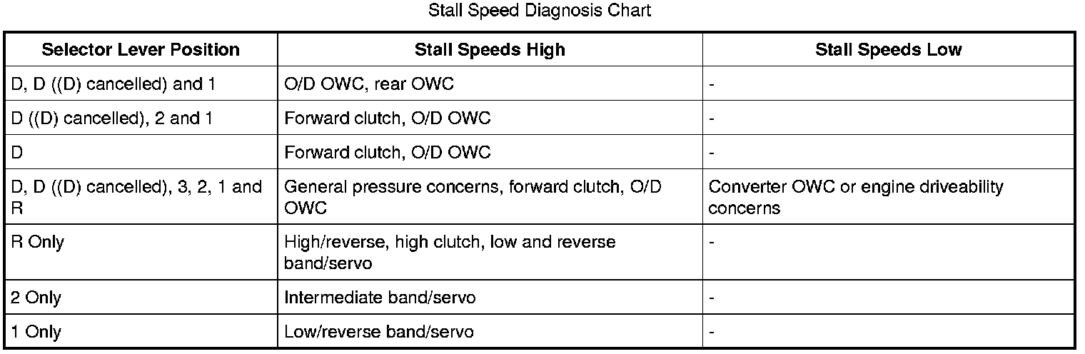 If the stall speeds were too high, refer to the following Stall Speed Diagnosis Chart. If the stall speeds were too low, first check the engine idle speed. If the engine idle is OK, remove the torque converter and check the torque converter OWC for slippage.