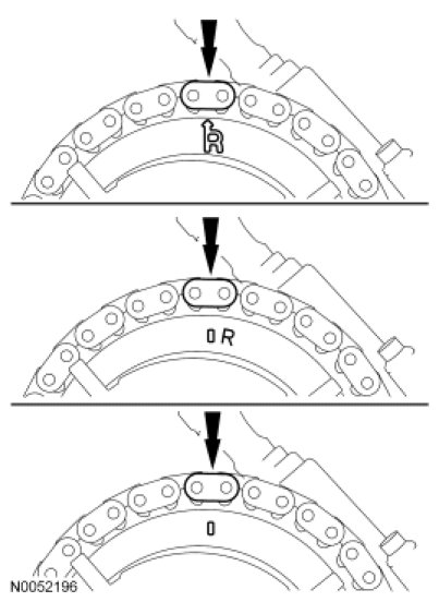 Position the RH timing chain on the camshaft sprocket. Make sure the camshaft sprocket timing mark is aligned with the colored (marked) chain link.