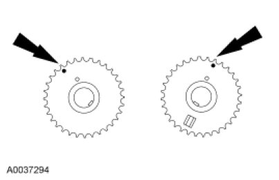 Position the camshaft sprocket timing marks as shown.