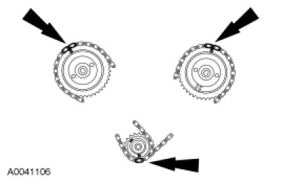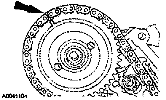 Install the RH timing chain on the camshaft sprocket, aligning the 2 colored links with the timing mark on the sprocket.