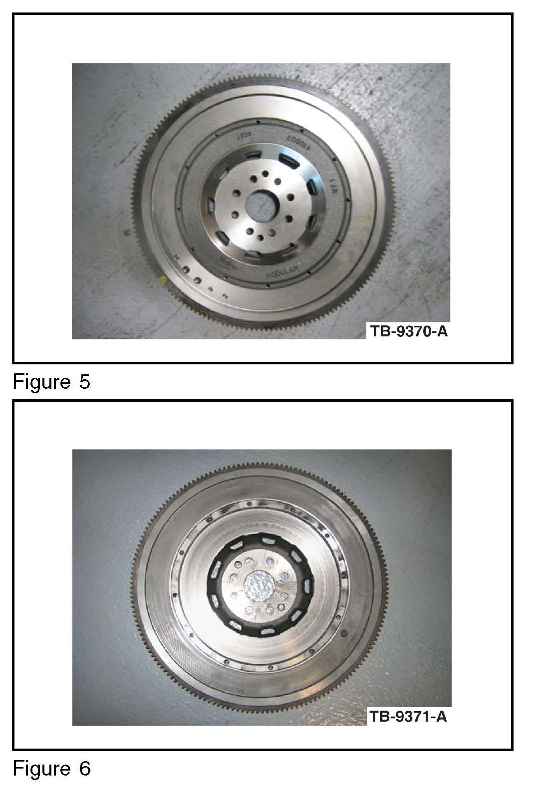 Located at the end of the procedure are Figures 1, 2 and 3 which show the typical appearance of a flywheel and clutch that has been damaged due to overheating of the clutch. Figures 4, 5 and 6 show the typical appearance of a good flywheel and clutch.