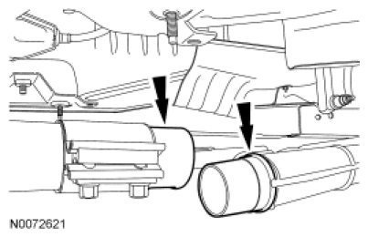 10. Loosen the exhaust coupler and disconnect the intermediate pipe from the catalytic converter. Discard the exhaust coupler.