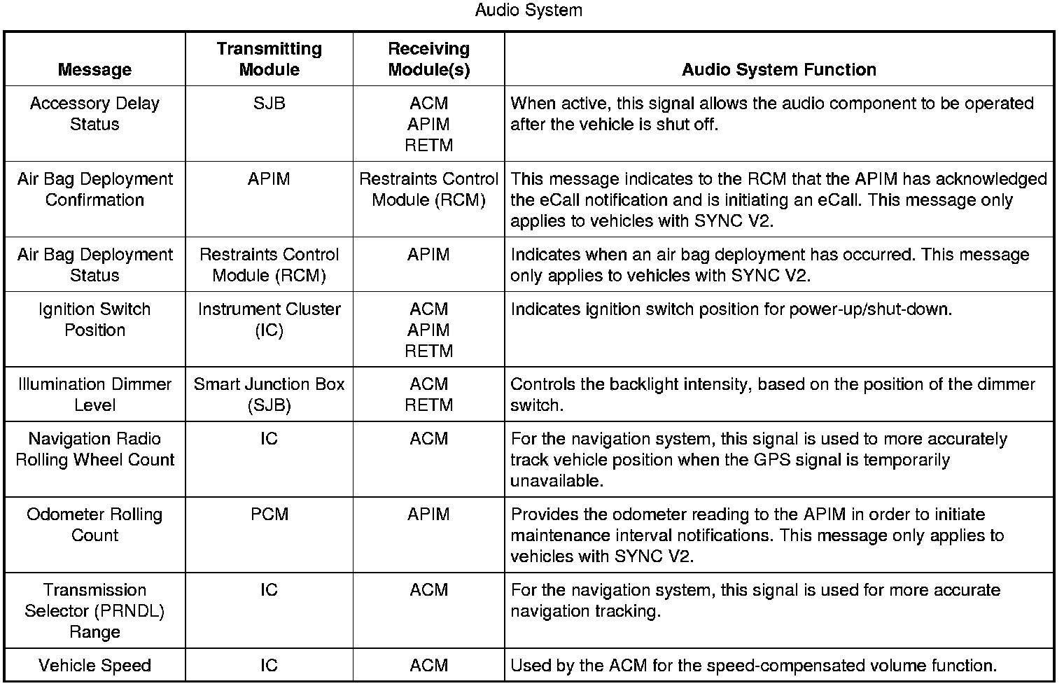 When the audio system enters voice recognition mode, the ACM initially controls the voice recognition feature. The microphone is wired directly to the APIM, which relays the microphone input to the ACM through dedicated wiring. If the first command spoken is part of the ACM voice recognition set, the ACM retains control of the voice recognition and takes the appropriate action(s). If the first command spoken is part of the APIM voice recognition set, the ACM shuts off its own voice recognition and broadcasts a Controller Area Network (CAN) message to the APIM, transferring the voice recognition to the SYNC system and providing the voice command that was spoken. The ACM controls the voice engine for the base audio, navigation, and climate control systems. The APIM controls the voice engine for the SYNC system (USB port, audio input jack, Bluetooth).