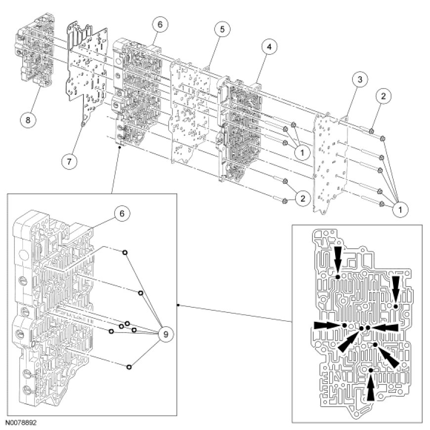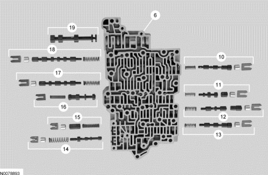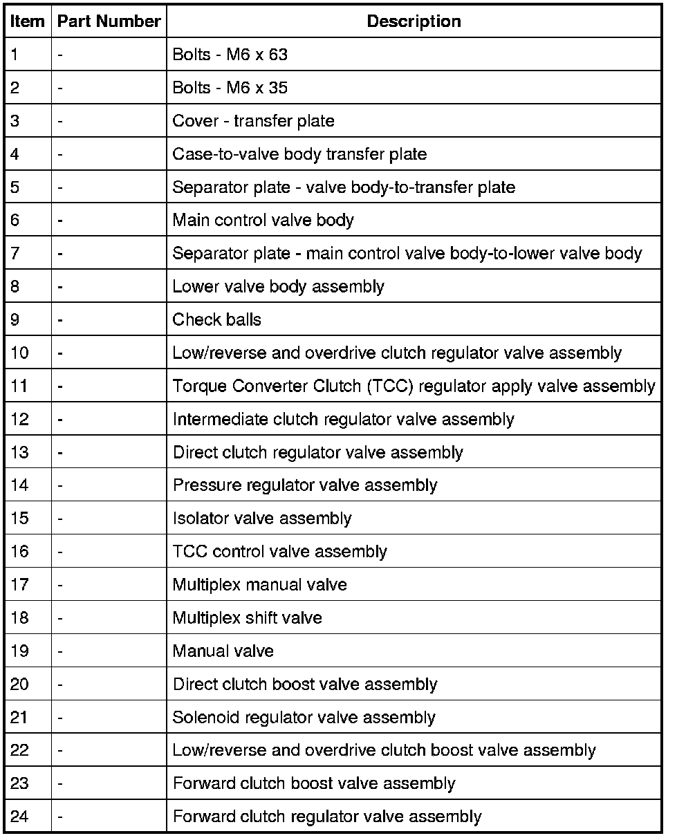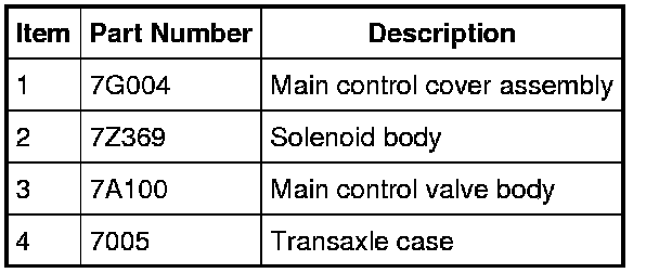 The hydraulic system has a main control assembly. The main control assembly consists of a valve body and a solenoid body. The valve body contains the hydraulic regulator and multiplex shift valves. The solenoid body contains the shift solenoids that control the hydraulic valves. The solenoid body is serviced as an assembly and can not be disassembled. The solenoid body is controlled by the PCM. The PCM has software stored in it specific to the solenoid body currently in the transaxle, called the solenoid body strategy. A new solenoid body strategy must be downloaded into the PCM anytime a new solenoid body is installed.