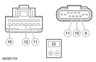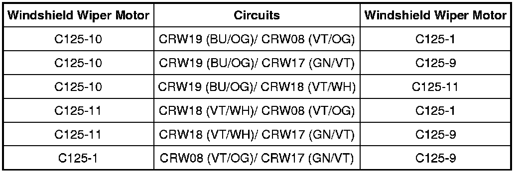 - Measure the resistance at windshield wiper motor C125 between the circuits shown in the following chart.