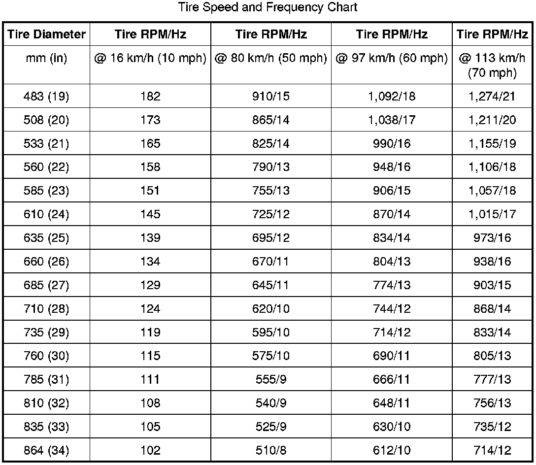 - Obtain the corresponding tire and wheel rpm and frequency from the Tire Speed and Frequency Chart.