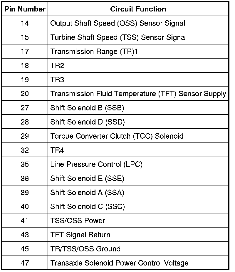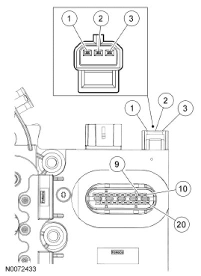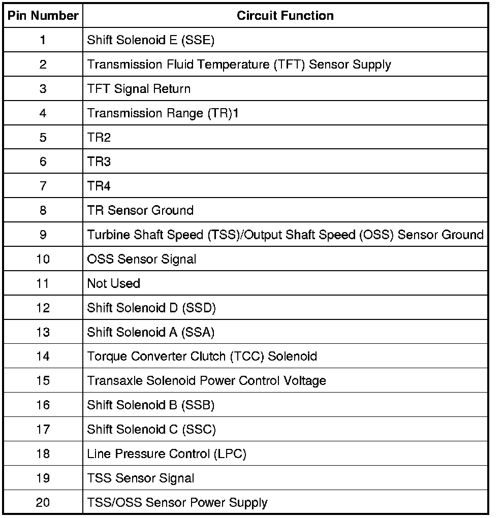 NOTE: The Output Shaft Speed (OSS) sensor connector is on top of the 20-pin solenoid body connector (next to the Transmission Range (TR) sensor connector).