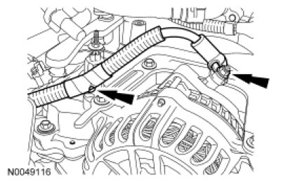 13. Detach the generator battery cable retainer from the RH valve cover stud bolt.