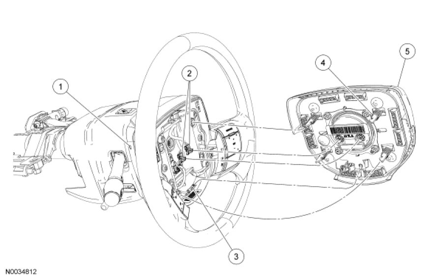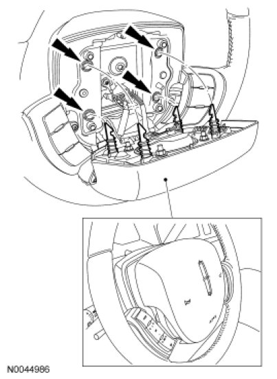 NOTICE: Make sure the steering wheel spring clips retaining the driver air bag module are disengaged from each of the 4 locking pins on the driver air bag module before removing the driver air bag module from the steering wheel. Failure to do so will damage the driver air bag module and steering wheel.