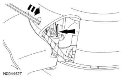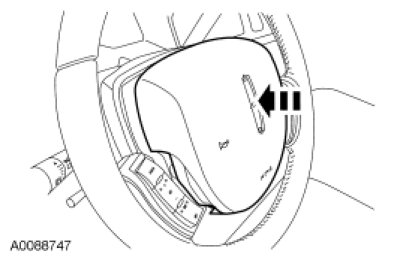Push the tool deeper into the access hole (approximately 4-8 mm [0.15-0.31 in]) with enough force to disengage the steering wheel spring clip from the driver air bag module locking pin. The corresponding corner of the driver air bag module should pop up once the spring clip is disengaged from the locking pin. Gently pull the corresponding corner of the driver air bag module to make sure the locking pin does not re-engage the spring clip. Remove the tool from the access hole. Discontinue pulling on the corresponding corner of the driver air bag module.